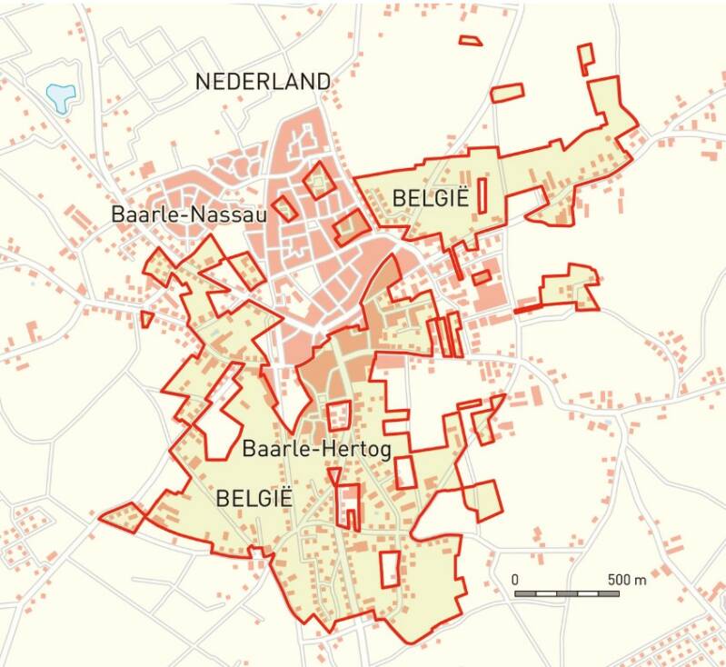 Het gaat hierbij niet om één grens, maar om diverse Belgische en Nederlandse enclaves. Wandel je door Baarle-Nassau, dan zie je regelmatig speciale stoeptegels die de grenzen van deze enclaves aangeven. De grens kan soms zelfs dwars door een winkel of café gaan.
