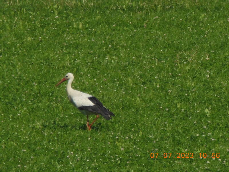 Even later slaan we de Hoge Maasdijk met wat mooie vergezichten. Terwijl we hier lopen zien we vanaf de dijk een oude kerk en spot een ooievaar in de wei.
