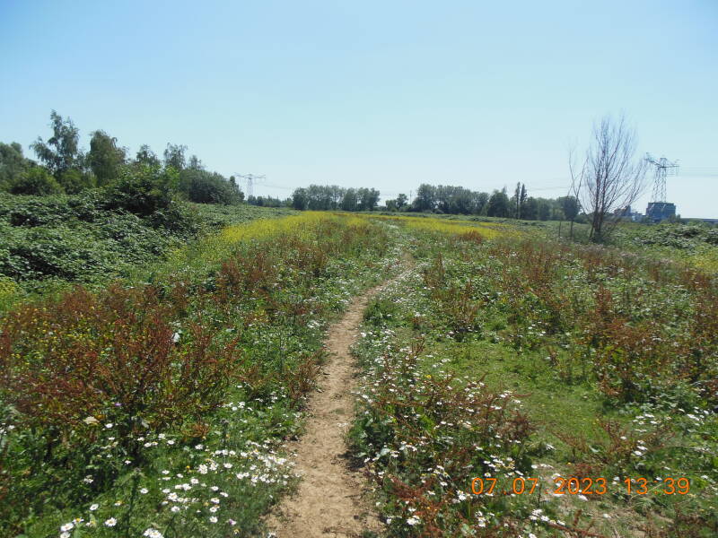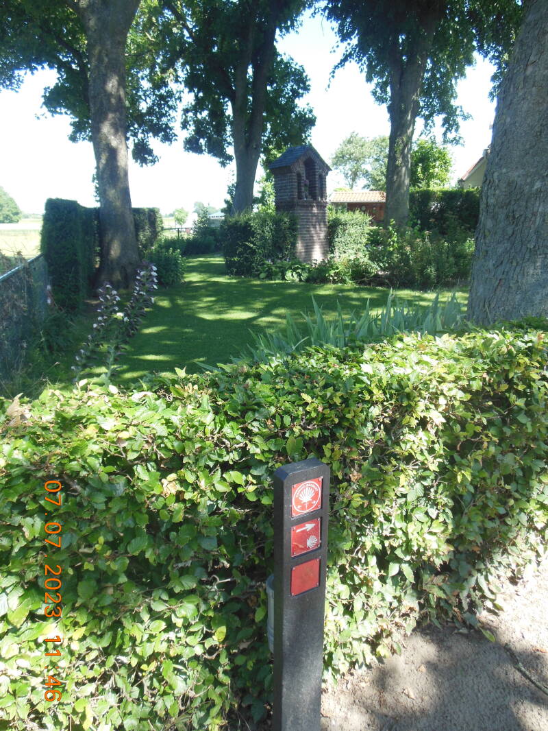 Na de rust wandelen we verder over de Bokhovense Maasdijk, die vervolgens overgaat in Graaf van Solmsweg. We slaan linksaf de brug Henriettewaard over en meteen linksaf langs het Kanaal Henriettewaard over een houten brug en wandelen tegen het hekwerk van Engelense Gat (Genie: Bruggenschool). Wandelen over de Gemaalweg, even zien we de St. Jan al voordat we het natuurgebied "Fransche Wielen" ingaan en wat later wandelen we op de Engelsedijk en ontdekken de markering van de Camino Brabant en Camino Jacobsweg op een verkeerspaal! En eigenlijk naderen we het tweede stempelpost in Orthen.