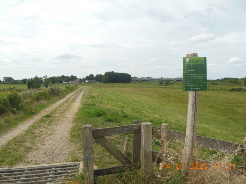Hier plaatsen we een stempel en wandelen verder en slaan even later de Poeldonksedijk op. Op deze splitsing staat het ouderlijk huis van een kennis van mij en zij was de gids voor mij in deze regio. Helaas was het druk bij de “Theetuin” en ben doorgewandeld. Nadat we over de “Dungense Brug” zijn gegaan gaan we richting Berlicum. Wandelen nog een stuk langs de AA en slaan bij knooppunt 24, eerst een trapje af, over een pad (flora-fauna) naar Berlicum.