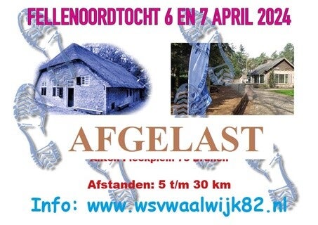 Op 6 en 7 april zou de Fellenoordtocht georganiseerd worden door wsv Waalwijk ‘82. Zou deze tocht in de planning opgenomen hebben met 2x 30km, uiteindelijk doel: Nacht van Loon. Vanwege het plotseling overlijden van de secretaris van de vereniging is deze afgelast.