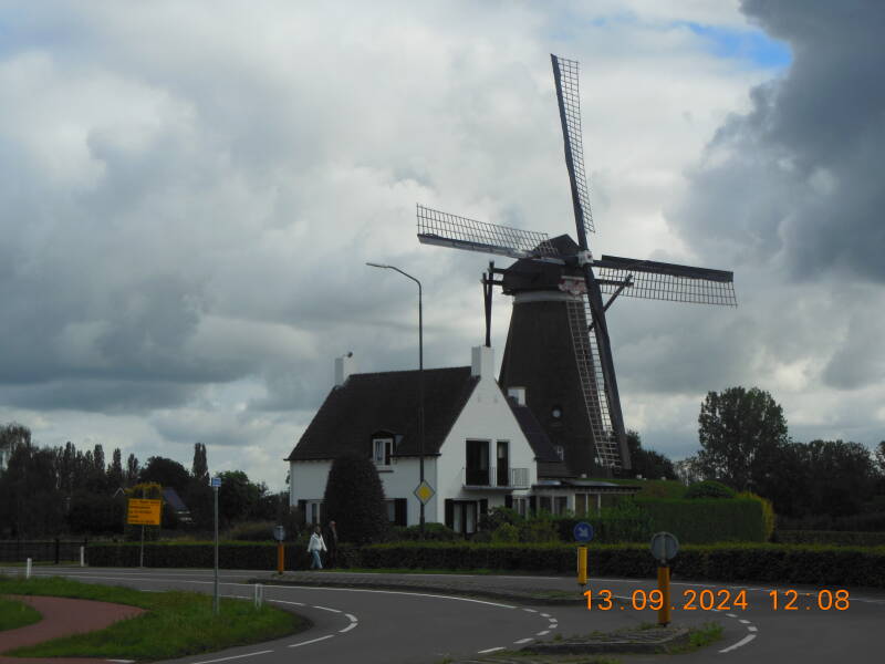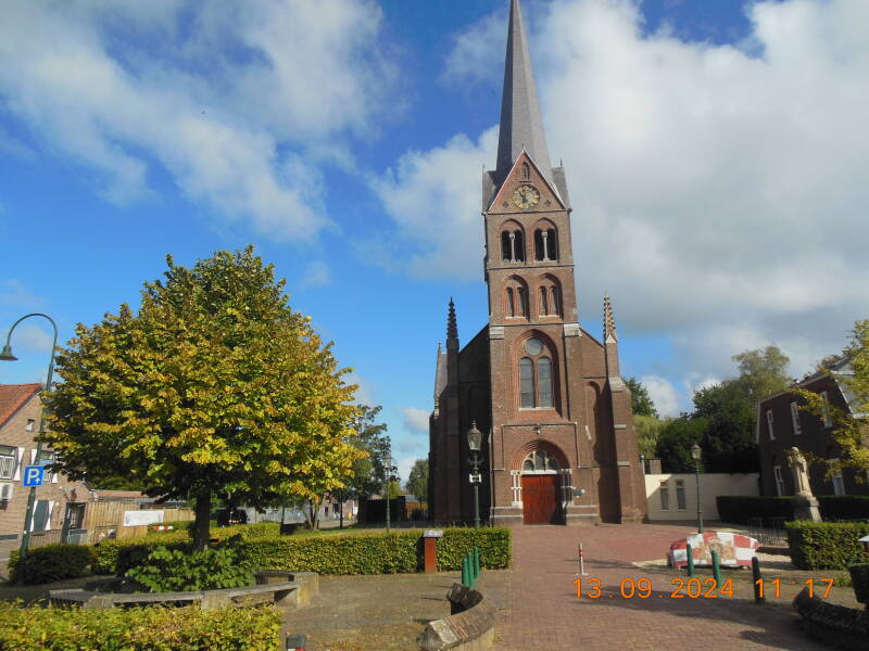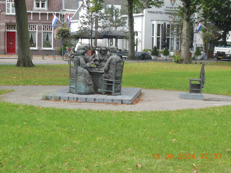 Maar goed na het passeren van de korenmolen (geschilderd door vanGogh) pakken we de route weer op en wandelen richting centrum Nuenen. We wandelen door een parkje en zien een standbeeld van vanGogh en de aardappeleters. Hier gaan we linksaf naar de Heilige Clemenskerk om een stempel op te halen.